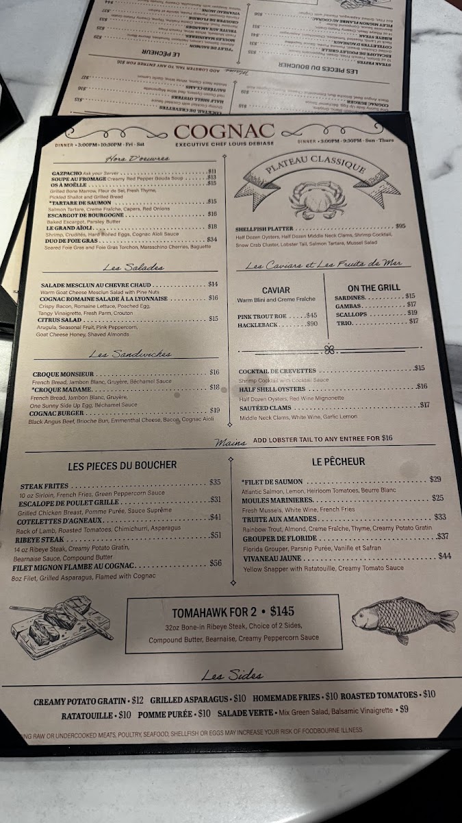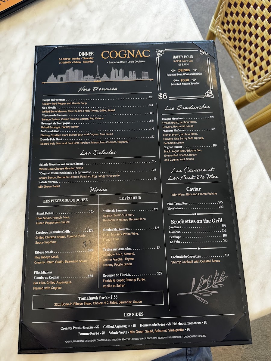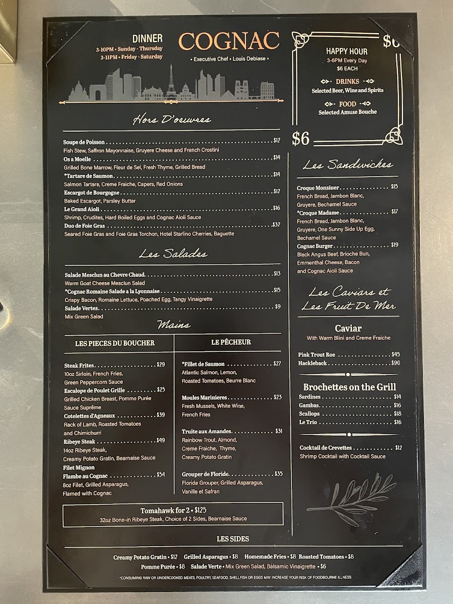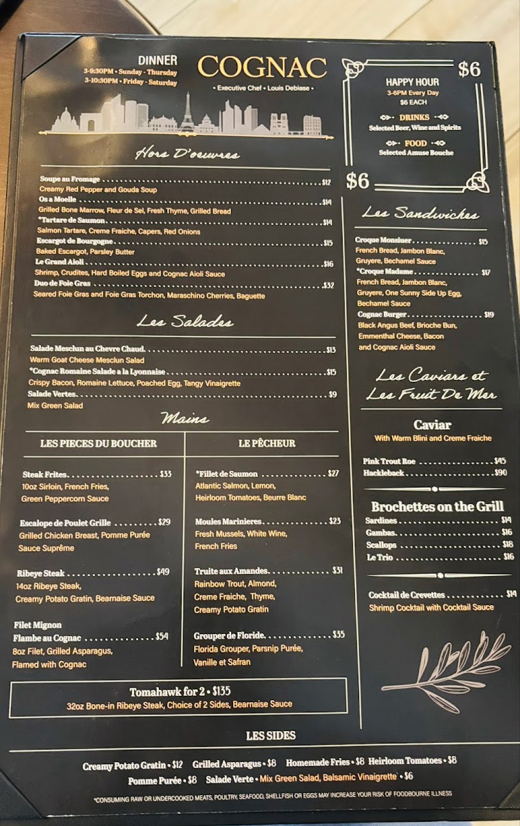 Cognac, nestled in the heart of St. Petersburg, Florida, offers an exquisite French dining experience that consistently captivates its guests. The menu masterfully balances rustic charm with refined flavors. Highlights include the Brochettes On The Grill—sardines, gambas, and a scallop trio, each grilled to perfection. From the land or sea, the Le Pêcheur section serves elegant dishes like Moules Marinieres, Truite Aux Amandes, and fresh Grouper De Floride. Complement your main with savory sides such as grilled asparagus, roasted tomatoes, or homemade fries.